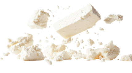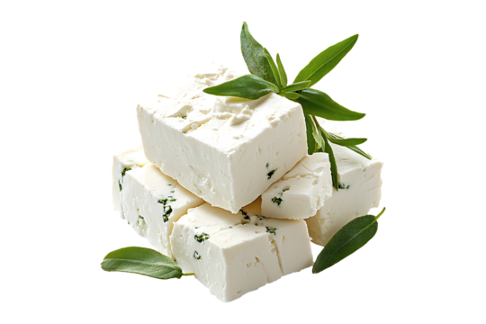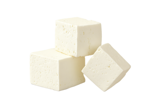 Fresh feta cheese cubes isolated on transparent background, traditional Greek dairy product made from sheep s milk for salads and cooking