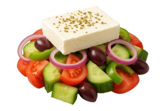 Salad with feta cheese, cucumber, cherry tomatoes, olives and basil in a white bowl isolated on white or transparent, PNG