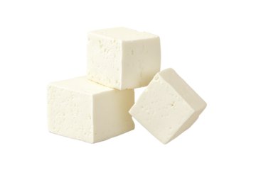 Stacked cubes of white feta cheese with crumbly texture isolated on a transparent background dairy food