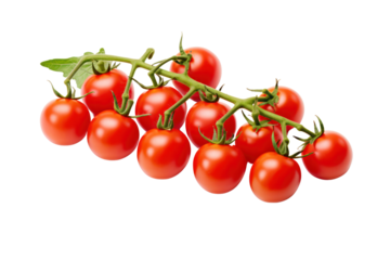 Fresh cherry tomatoes with vibrant red skin and a few green stems, arranged neatly on a white background