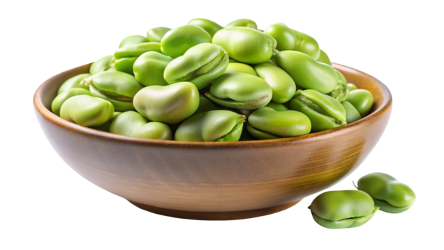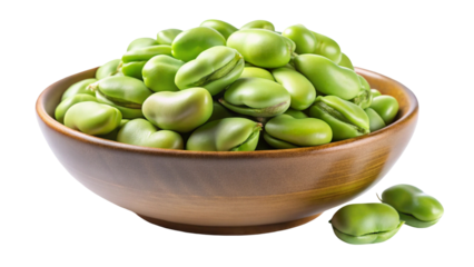 A rustic wooden bowl filled with fresh green fava beans and a few scattered beans isolated on transparent background