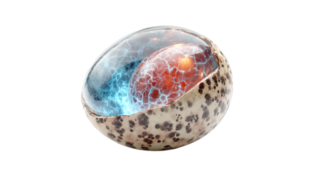 Exotic alien egg with transparent shell and glowing embryo, sci-fi biology, isolated on a white background