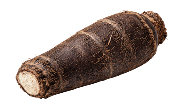Freshly harvested cassava root highlighting dark fibrous texture and organic quality isolated on transparent background PNG