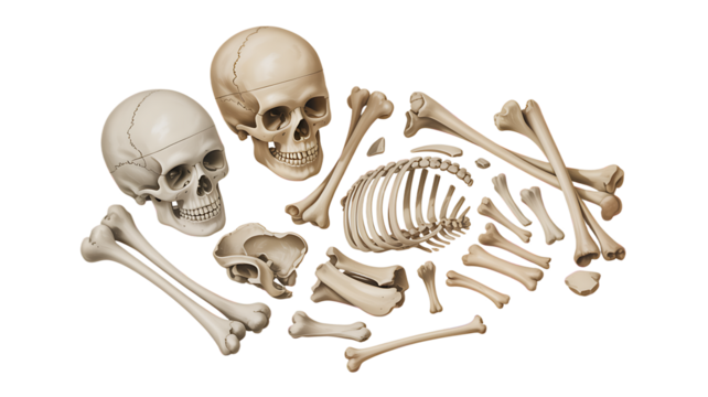 Set For Three anatomical skeletons isolated on transparent background, bone structure