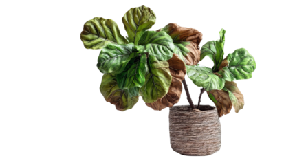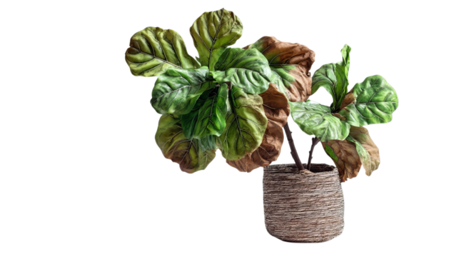 PNG of A vibrant green and brown fiddle leaf fig plant in a rustic woven basket, adding a touch of nature to any space.