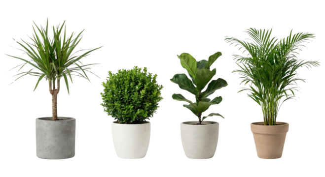 Four potted houseplants including monstera, snake plant, fiddle leaf fig, and a leafy bush, isolated on transparent background