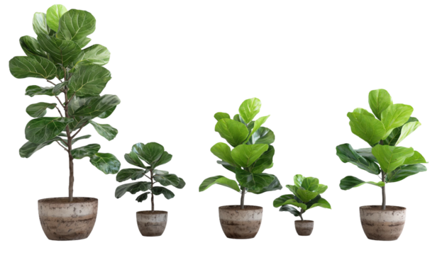 A close-up view of lush green fiddle leaf fig plants with broad leaves, isolated on transparent  background