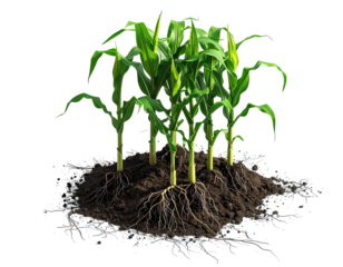 A vibrant young plant, roots exposed in soil, flourishing against a stark black background