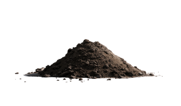 A small pile of dark soil sits isolated against a black background, showcasing the earthy texture