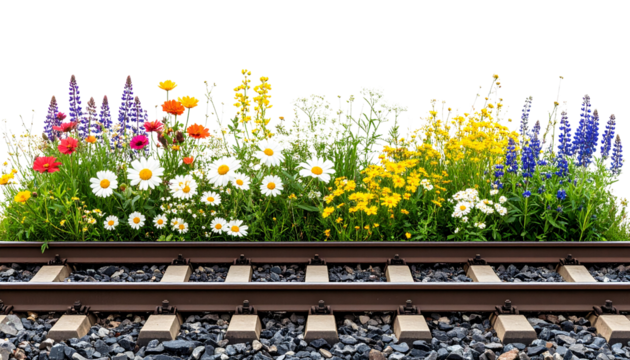 Wildflowers growing along train tracks isolated on transparent background. Png