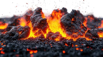 Render of a volcano erupting lava, dark rock, fiery orange glow against black