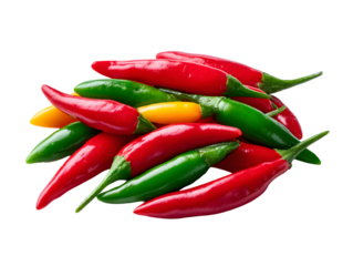 A vibrant pile of fresh red, green, and yellow bird's eye chilies. This essential, spicy ingredient is the heart of many fiery Thai and Asian dishes.