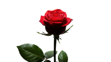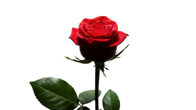 Single Deep Red Rose Blossom on Stem with Green Leaves isolated PNG with Transparent Background
