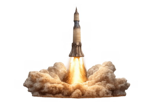 Rocket launching with fiery exhaust and smoke plumes, a symbol of space exploration and technological advancement