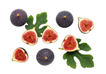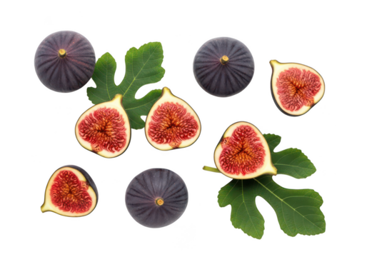 Fig isolated png. Figs with half and slice on white or transparent background. Fresh whole and cut purple fig no background. Full depth of field. Transparent png.
