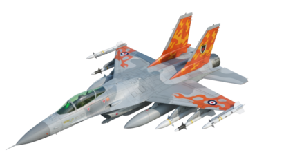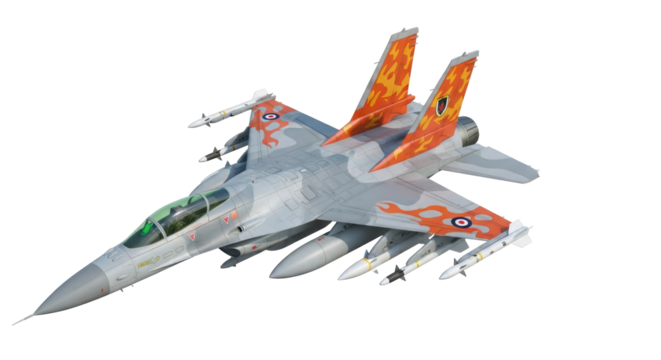 Military F-16 fighter jet with missiles isolated cut out png on transparent background