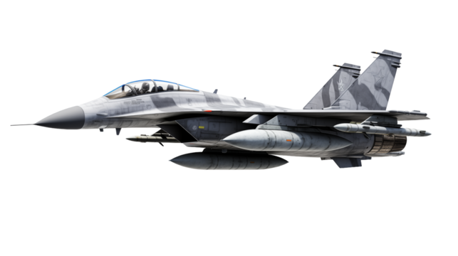 Gray fighter jet plane with swept wings and a glass cockpit tilted slightly to the right isolated on a transparent background