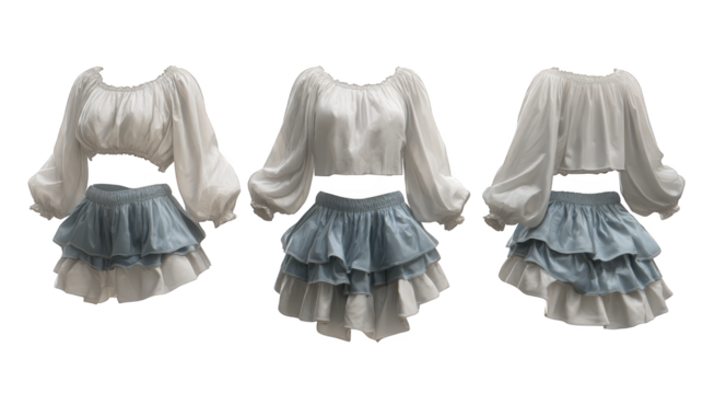 A detailed presentation showcasing three distinct perspectives of a stylish woman's garment highlighting its design fabric and silhouette from the front back and side views.