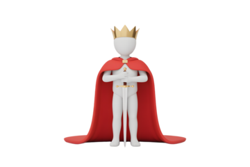 A 3d render of a stick figure king in a royal red cape and golden crown, holding a sword in a commanding pose.