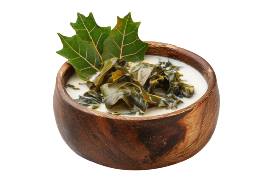 Rourou cooked taro leaves in creamy coconut milk, served in wooden bowl with garnishes, isolated on white transparent background, concept of Fiji cuisine