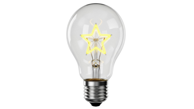 Star filament light bulb PNG isolated on transparent background, decorative lighting element for festive designs and creative projects
