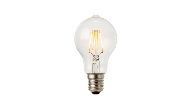 Realistic studio photo of a clear LED filament light bulb. Its classic, vintage-inspired design offers bright, warm, and energy-efficient illumination, isolated on a pure white background