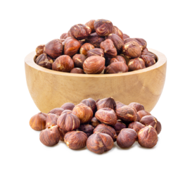 hazelnuts in wood bowl  on transparent png