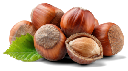 Three hazelnuts with green leaves isolated on transparent background