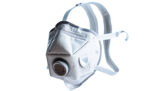 A single N95 face mask with a built-in filter and adjustable straps, isolated on aTransparent background, PNG file . The mask is shown with a close-up view of its filter and nosepiece