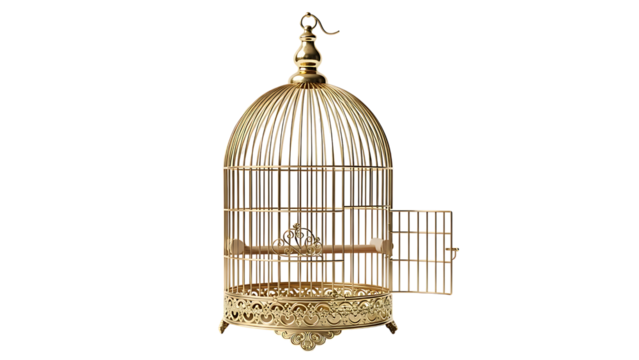 Golden birdcage with intricate design and open door