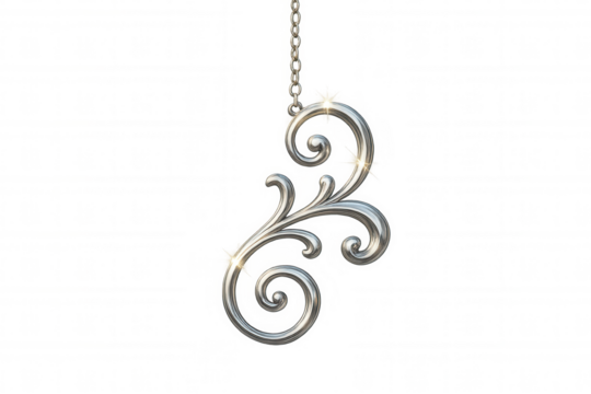 Silver filigree pendant on chain, elegant scroll design, shiny metallic jewelry ornament, transparent background