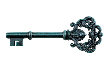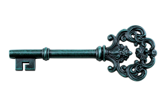 Ornate verdigris skeleton key, antique ornate, cut out transparent