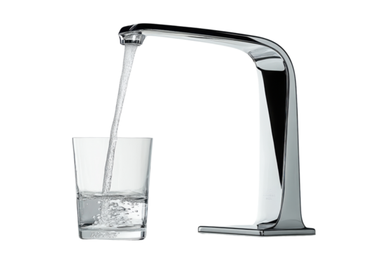Chrome faucet filling a glass with water isolated on transparent background. Clear glass fills with fresh water from a stylish faucet isolated on white background.
