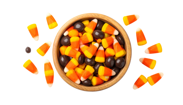 Overhead shot of a wooden bowl filled with candy corn & chocolate candies, scattered around