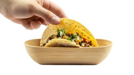 Hand dipping a delicious taco into a wooden bowl isolated on transparent background
