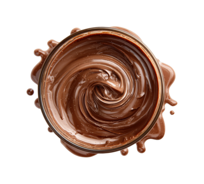 Top view of swirled chocolate spread in glass jar with spilled edges isolated on transparent background, png