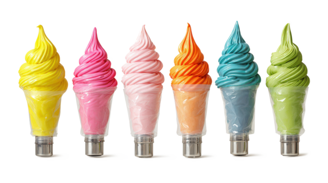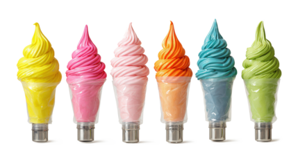 Pastry bags with nozzles filled with multicolored glaze isolated on a white background