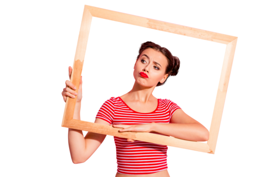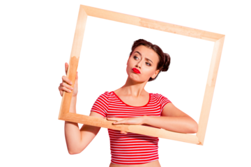 Portrait of her she nice-looking cute charming attractive glamorous bossy funny playful girl in striped t-shirt holding in hands wooden frame film movie posing isolated on pink pastel background