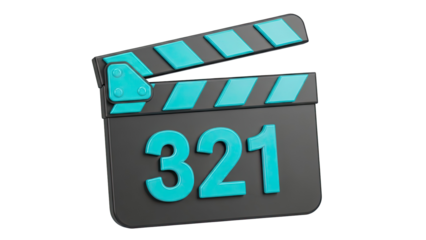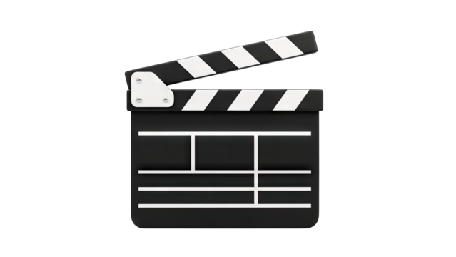 Woman holding movie clapperboard, smiling and acting as director or film producer, isolated on transparent background