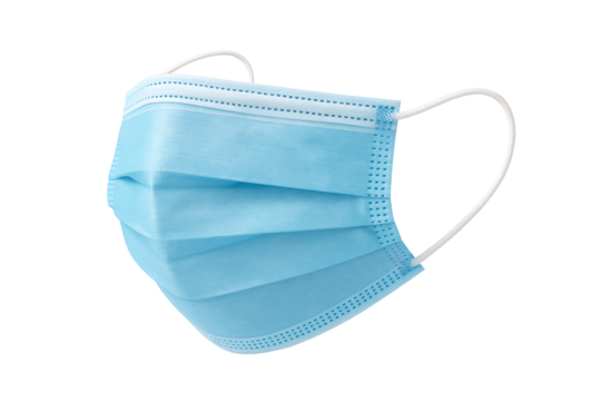 Blue medical protective face or surgical earloop mask isolated on transparent background