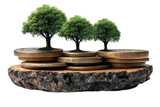 A creative representation of growth and sustainability, showcasing coins layered with trees, symbolizing financial investment in the environment.