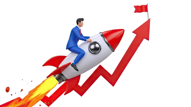 Businessman riding a rocket upwards on a graph with a flag