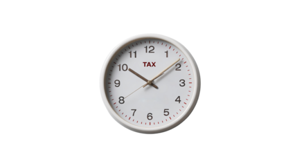 A round wall clock featuring TAX in red symbolizing the importance of time management during tax season on a transparent background