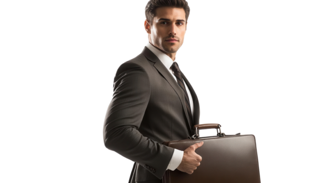 Confident businessman in a suit holding a briefcase, representing professionalism and success in a corporate environment.