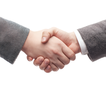 Two businessmen firmly shaking hands in agreement against a transparent background