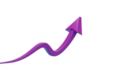 3d upward trend arrow on transparent background, purple glossy curved growth icon, business analytics and financial performance increase symbol for presentations and ui