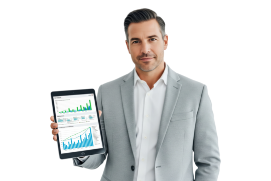 Business professional analyzing data on a tablet, visualizing growth and financial insights