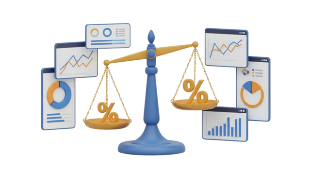 Balancing financial data and percentages using a 3d scale illustration for business analysis