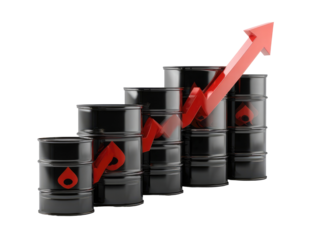 Black oil barrels arranged in ascending order with a red upward-pointing arrow overlayed, signaling growth