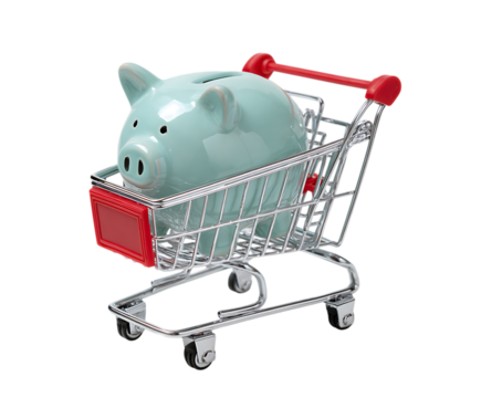 Mint piggy bank in mini shopping cart. Saving, budgeting, spending concept.
